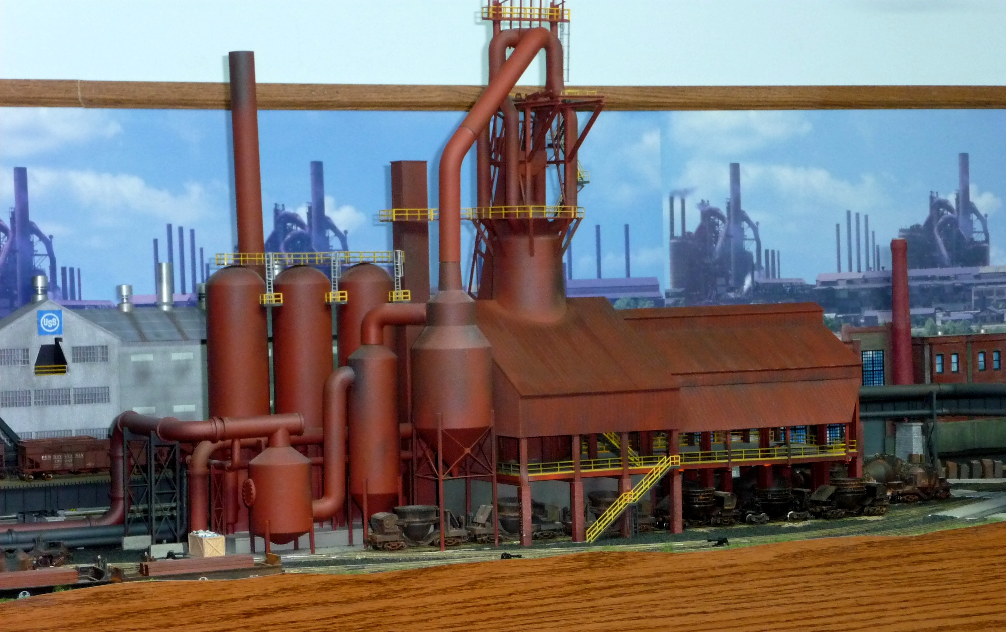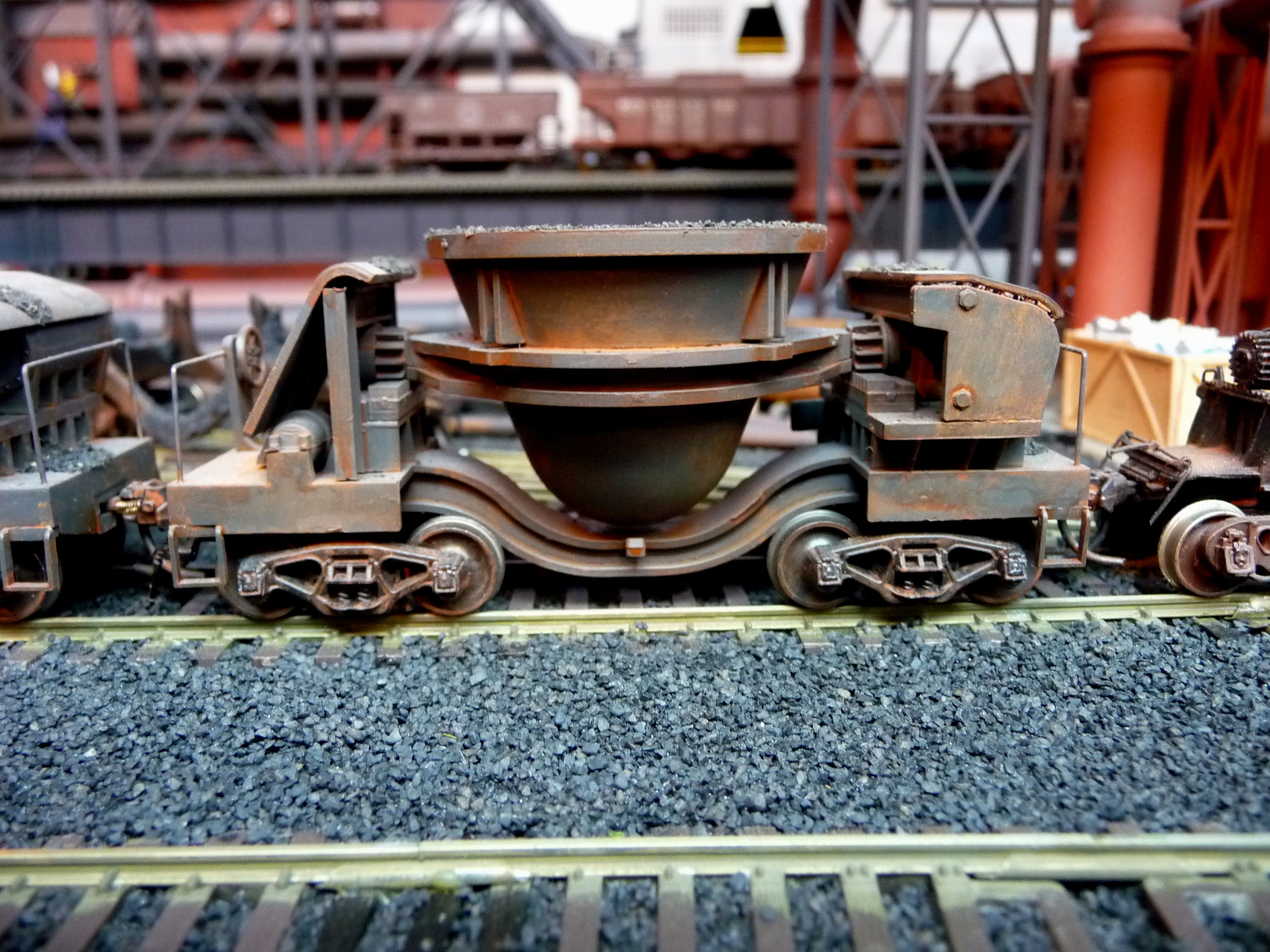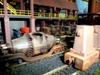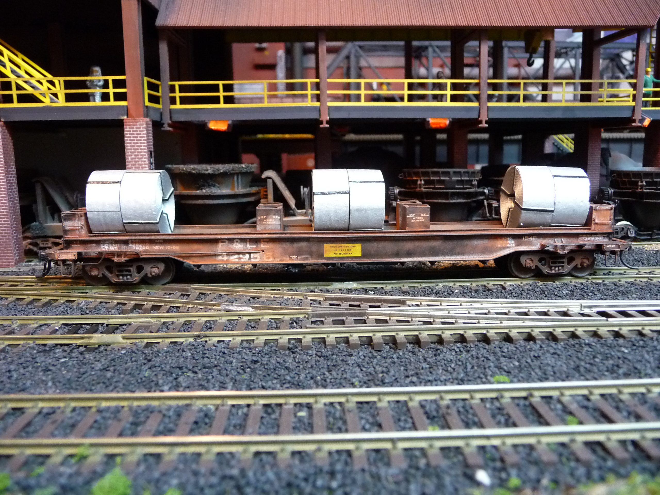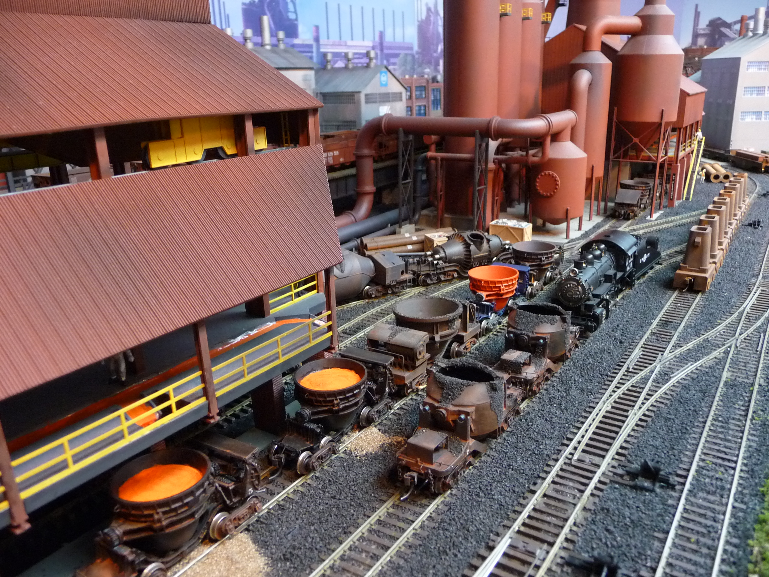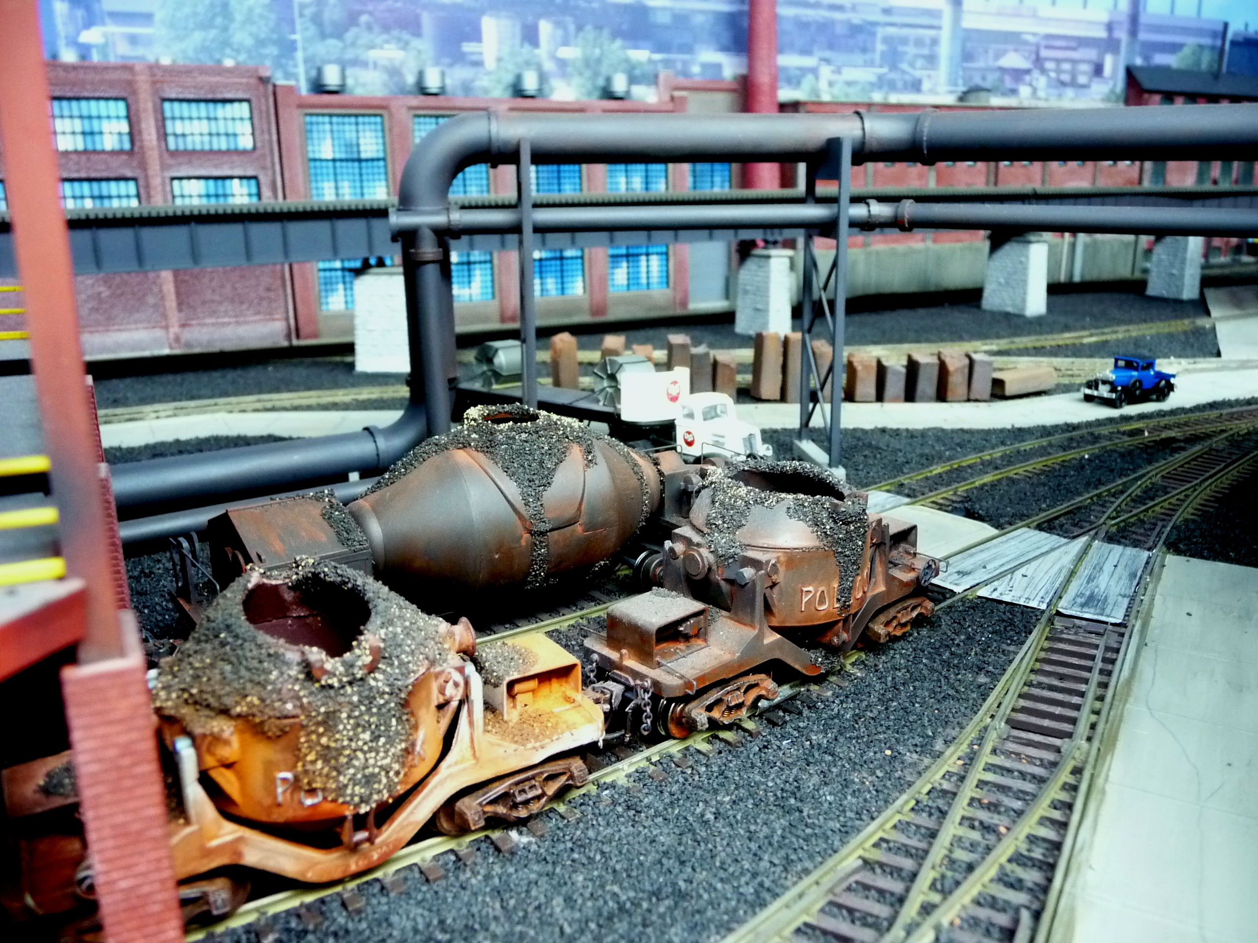 44. Track side view of hot slab cars and hot metal car. Background structures are scratch and kit bashed to fit the area. |