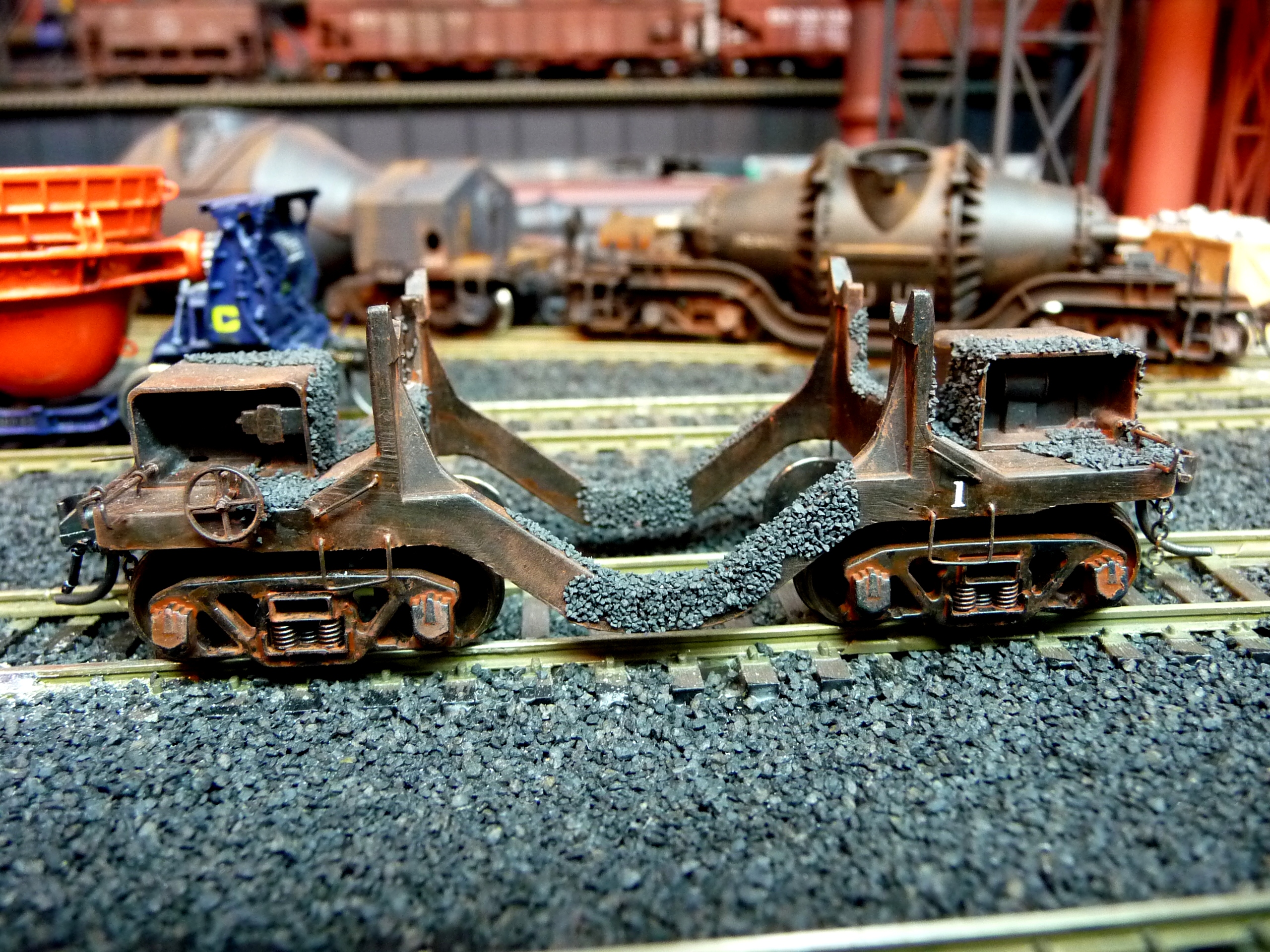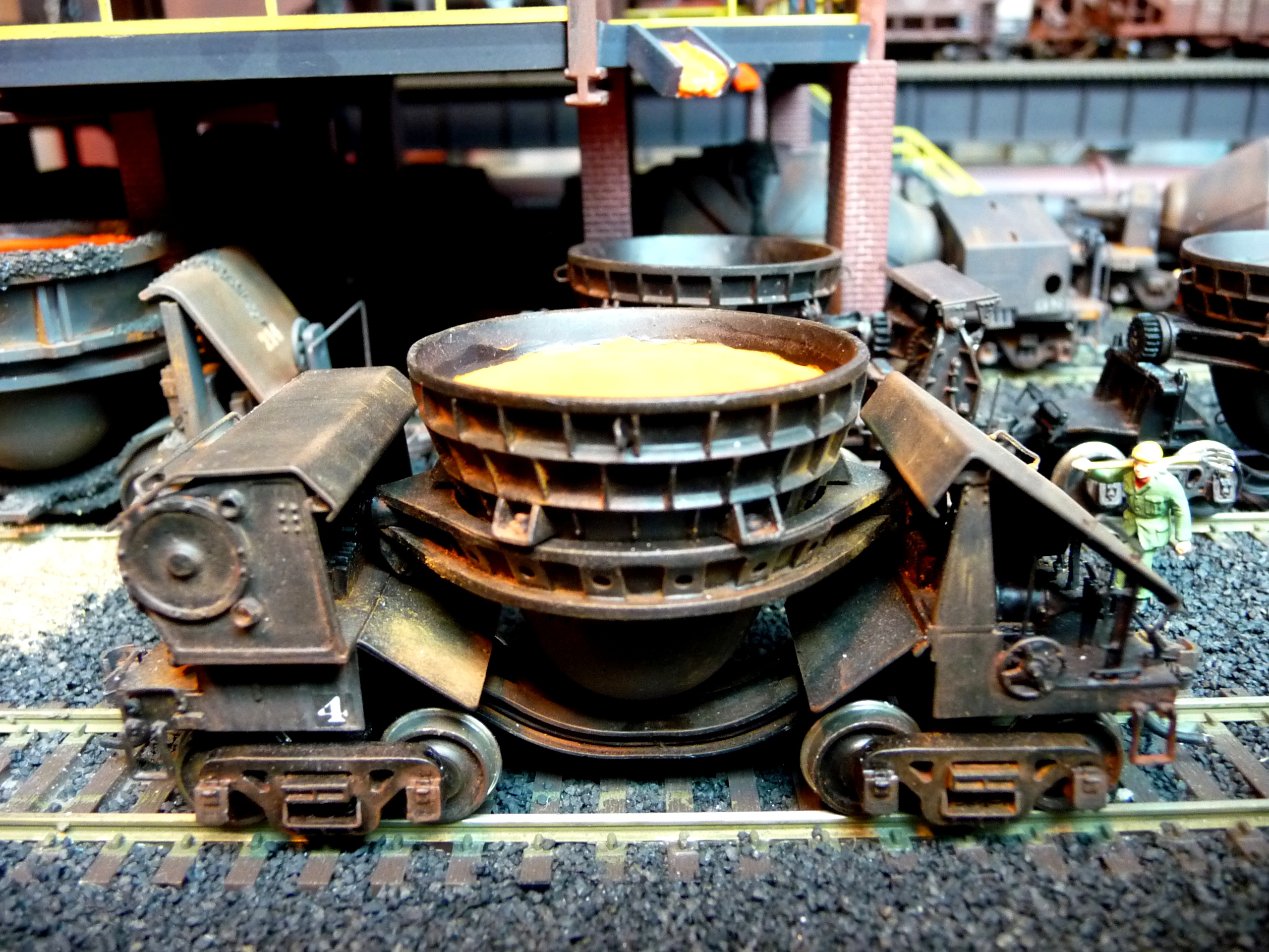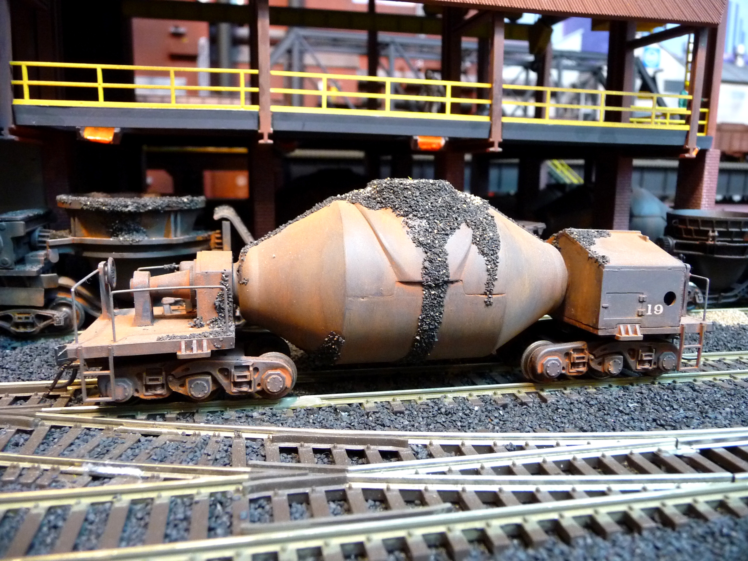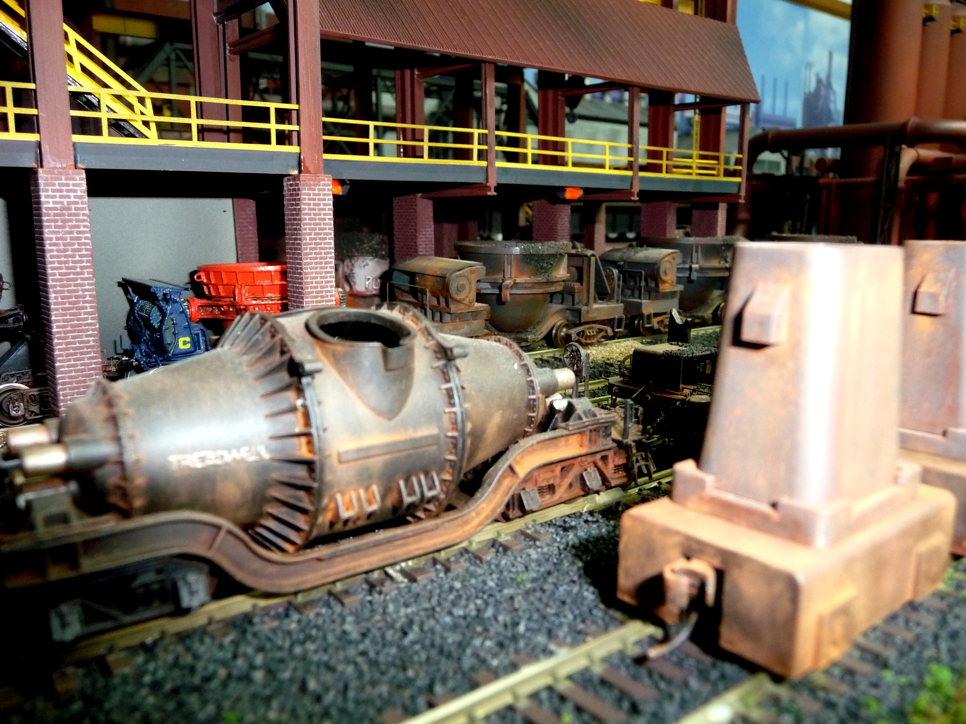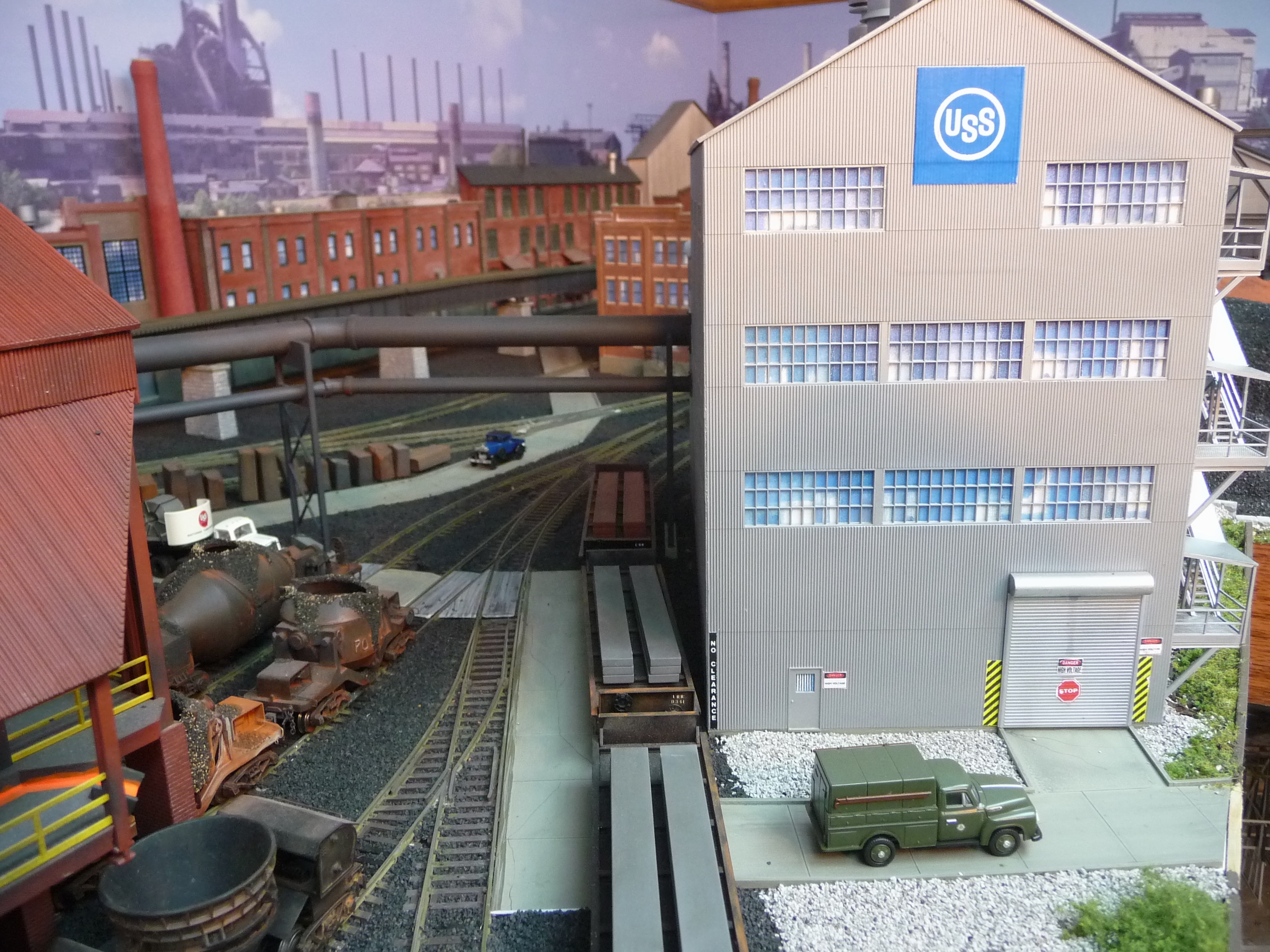 44. Track side view of hot slab cars and hot metal car. Background structures are scratch and kit bashed to fit the area. |