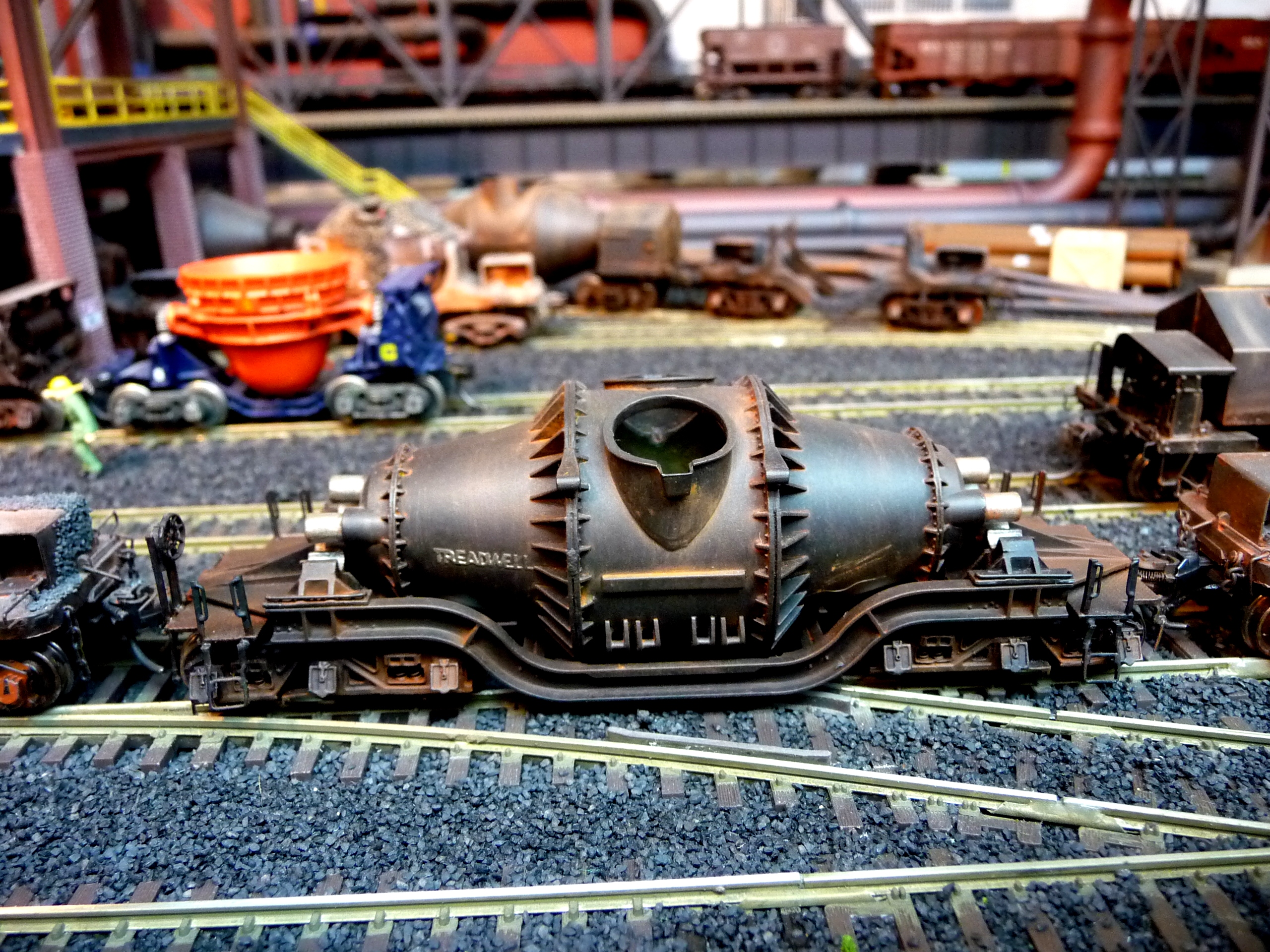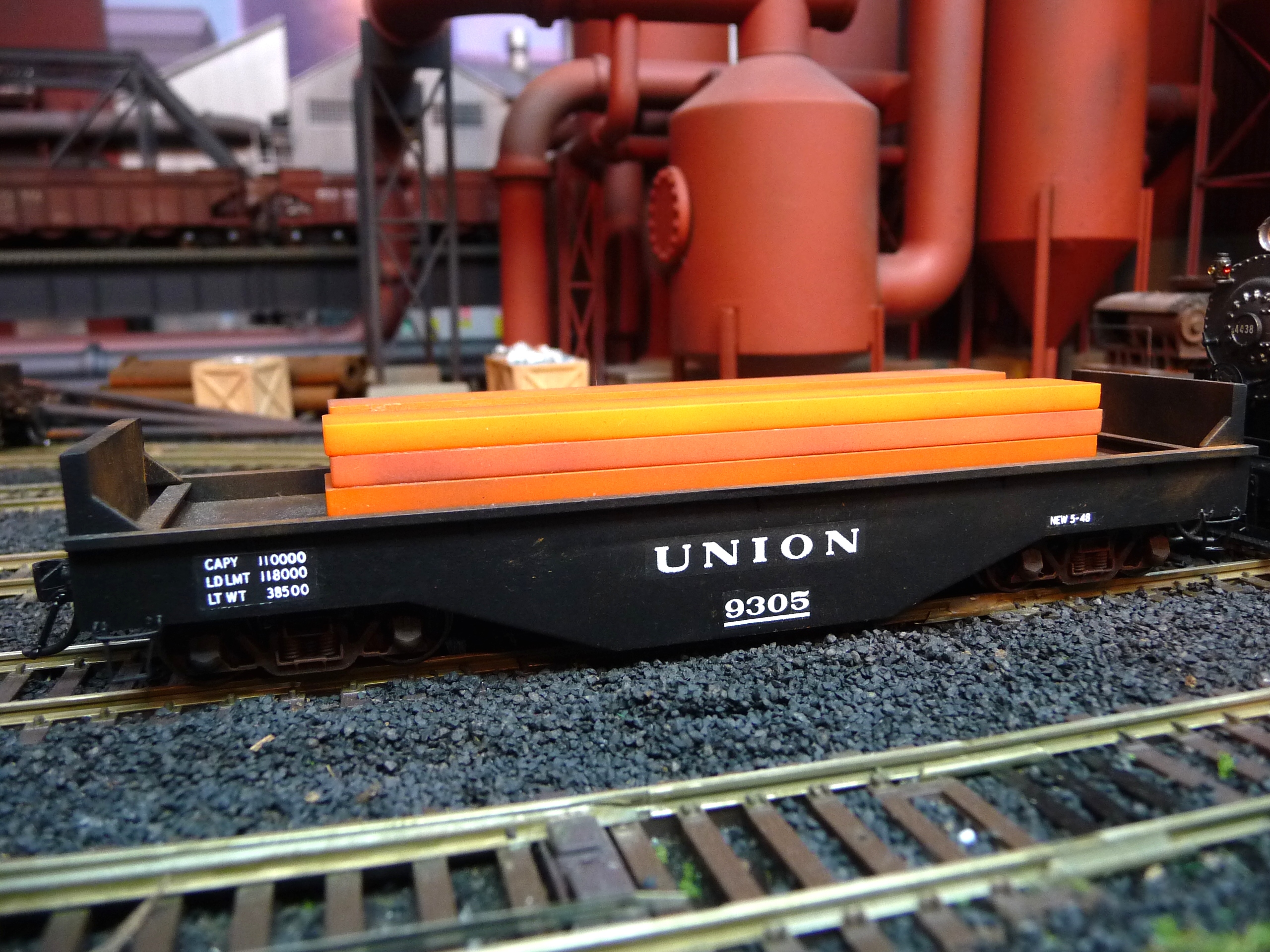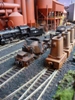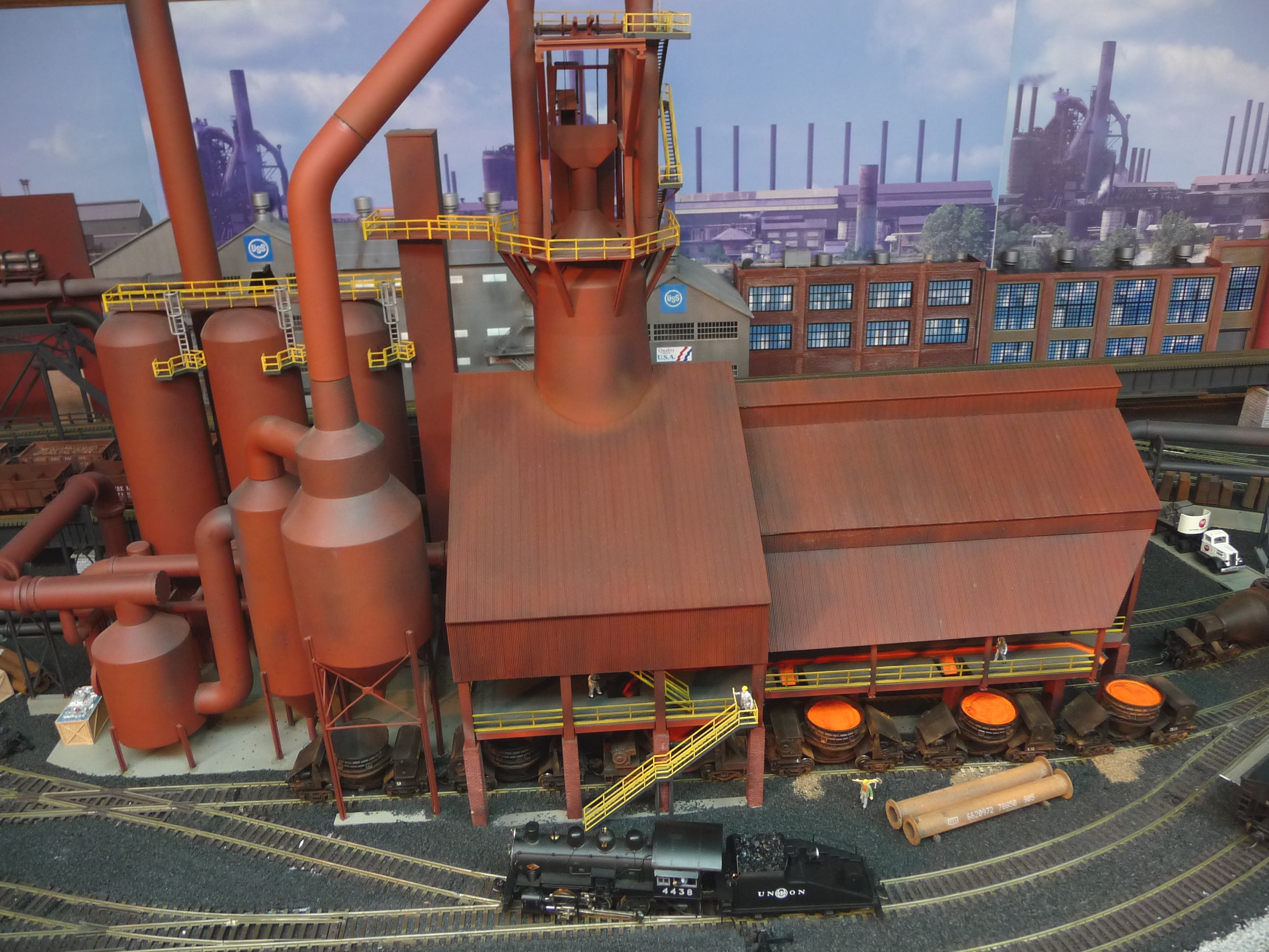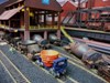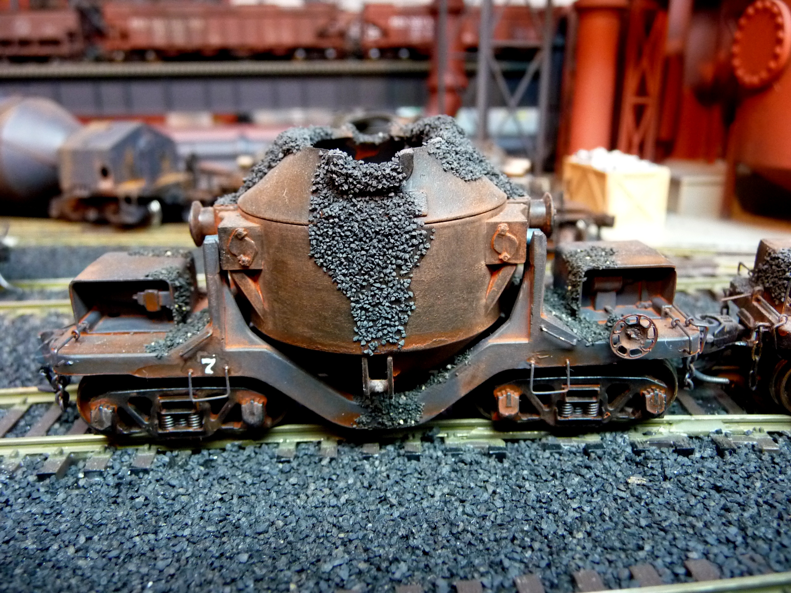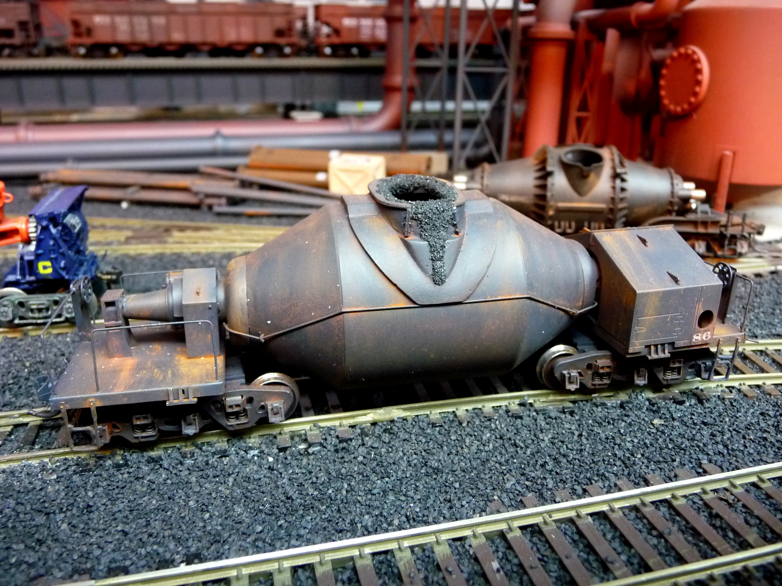 44. Track side view of hot slab cars and hot metal car. Background structures are scratch and kit bashed to fit the area. |