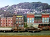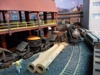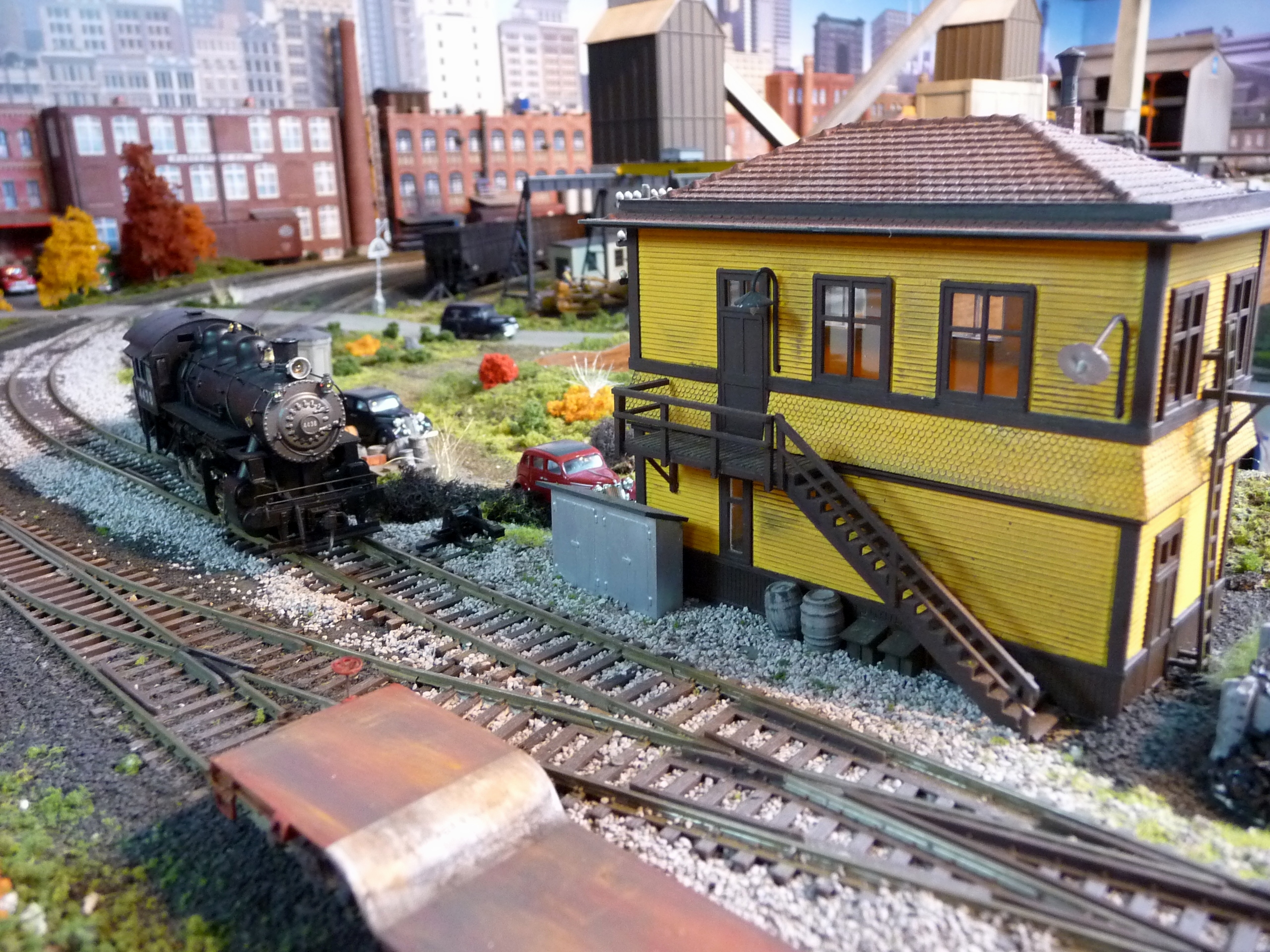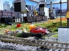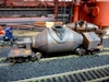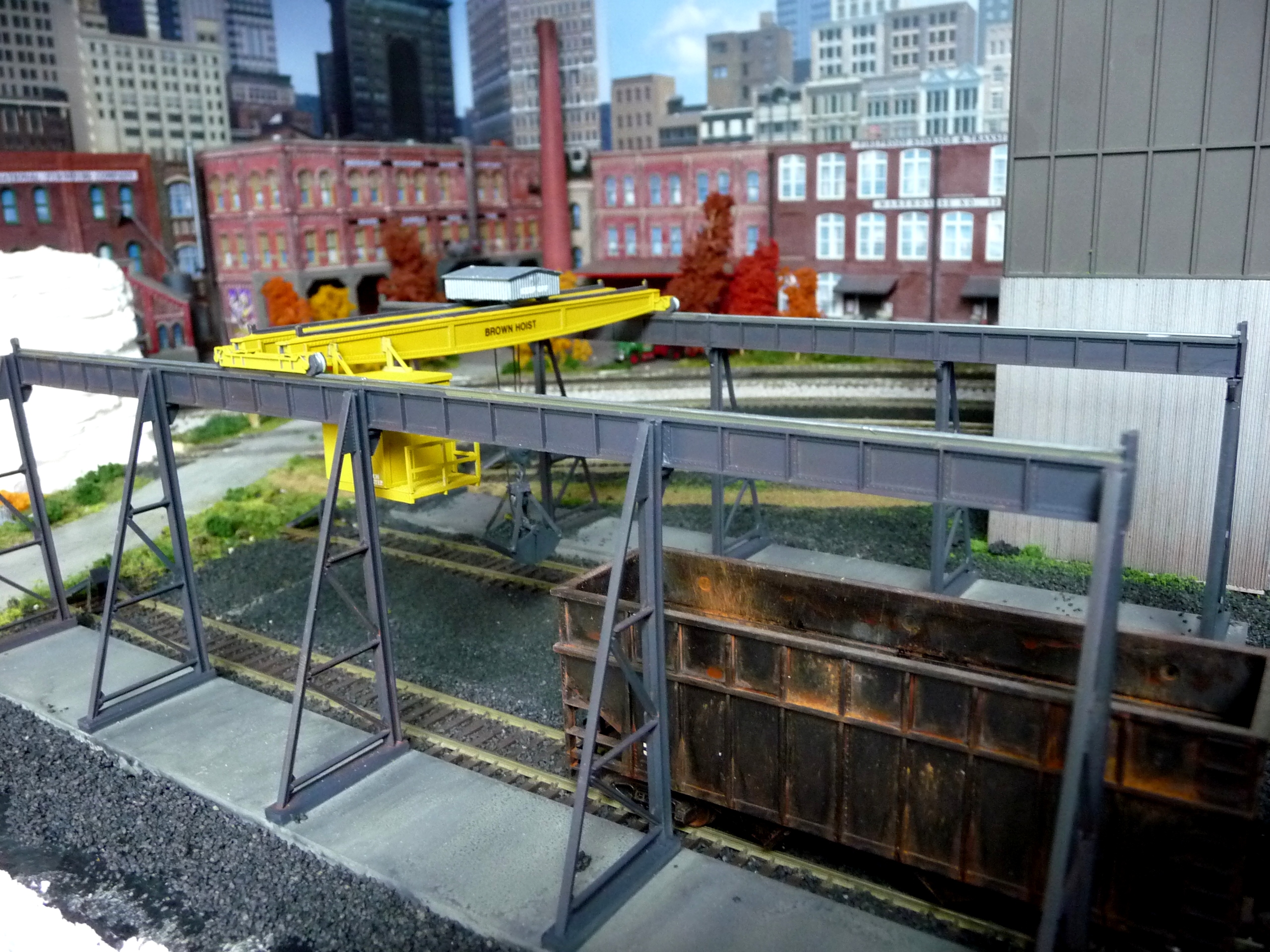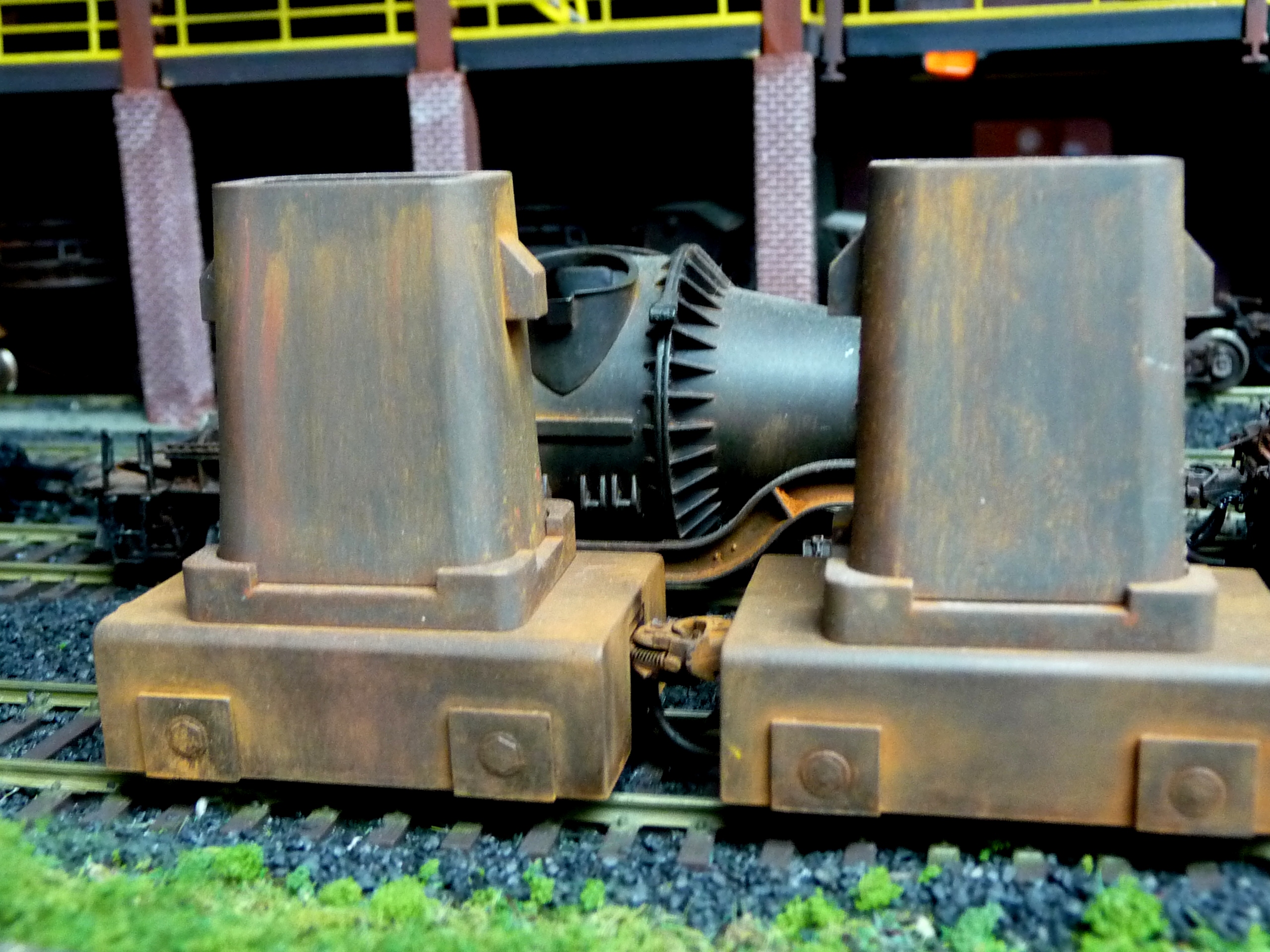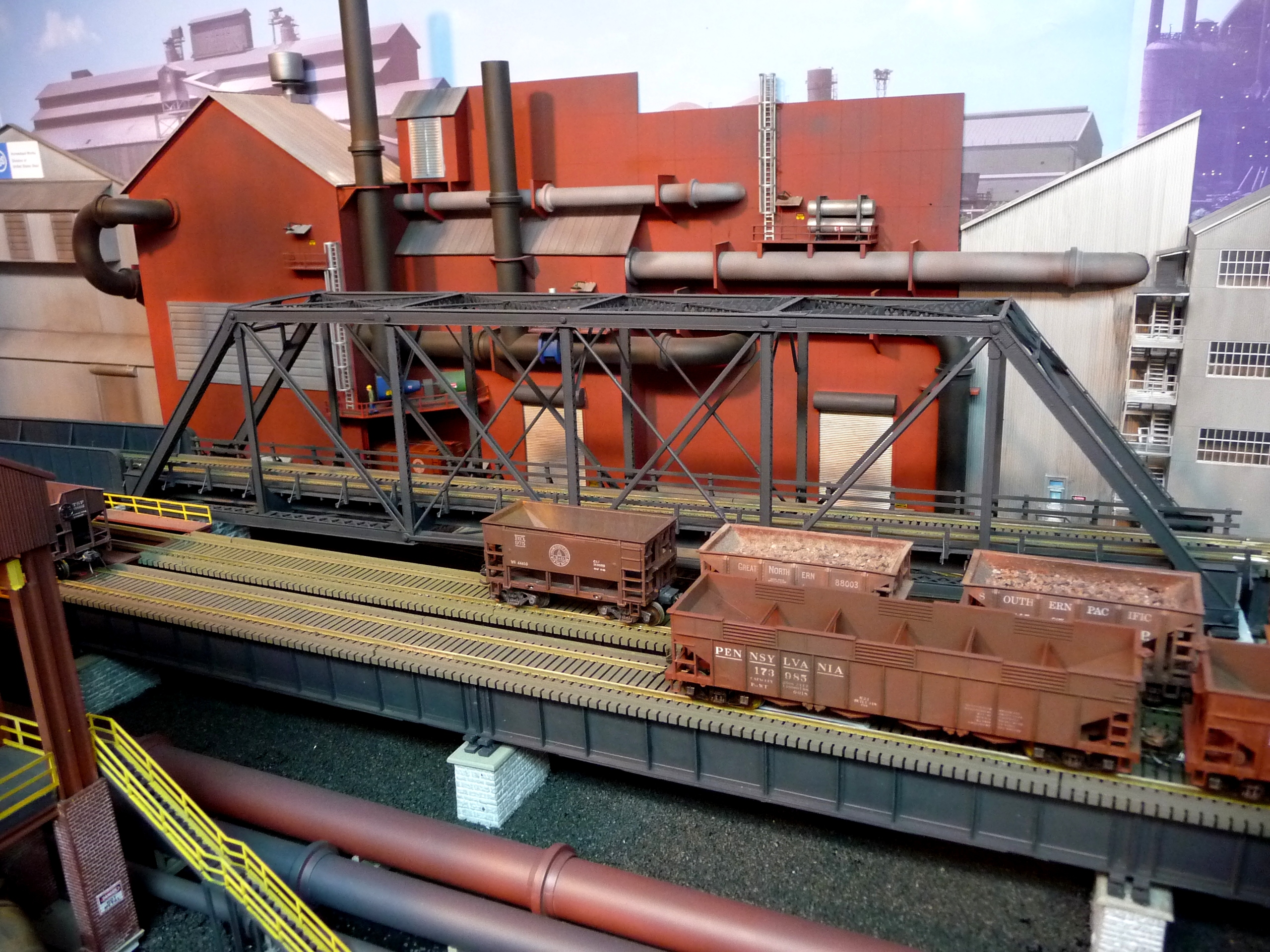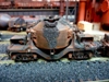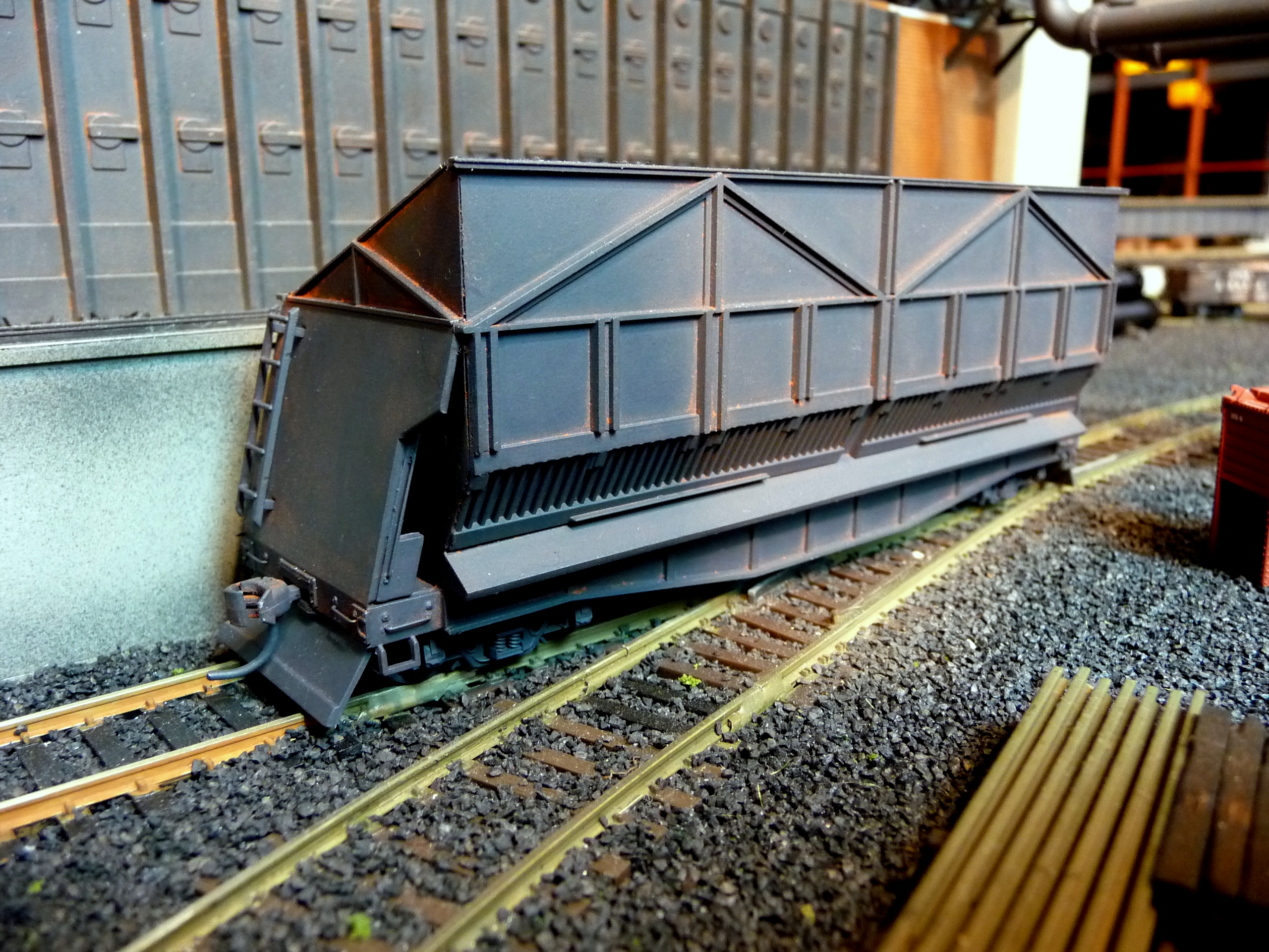 44. Track side view of hot slab cars and hot metal car. Background structures are scratch and kit bashed to fit the area. |