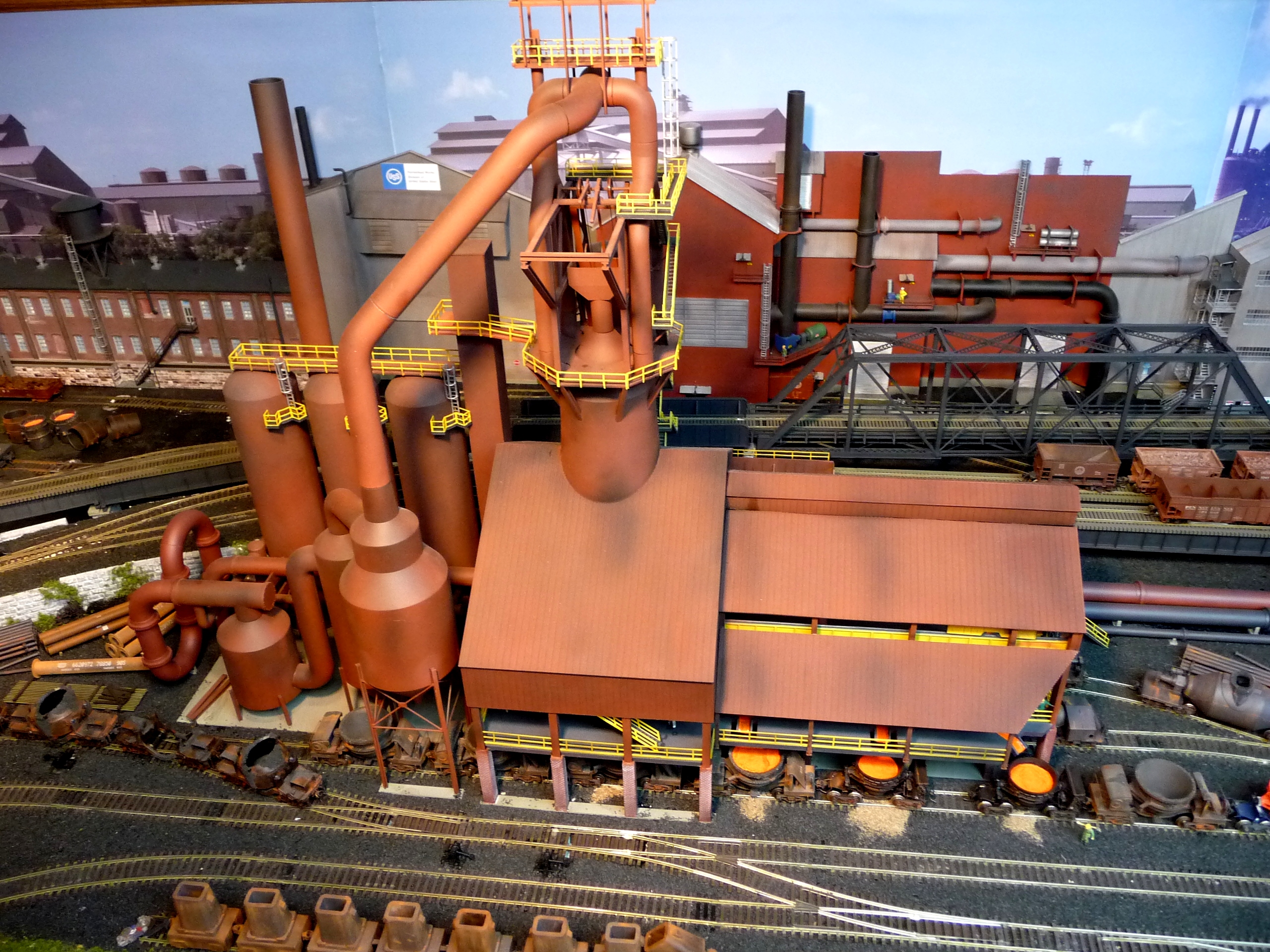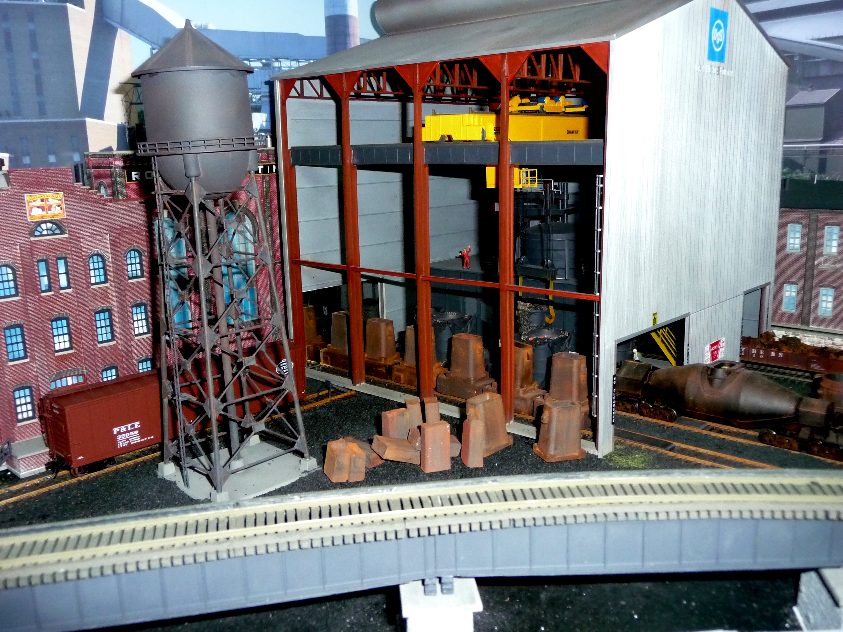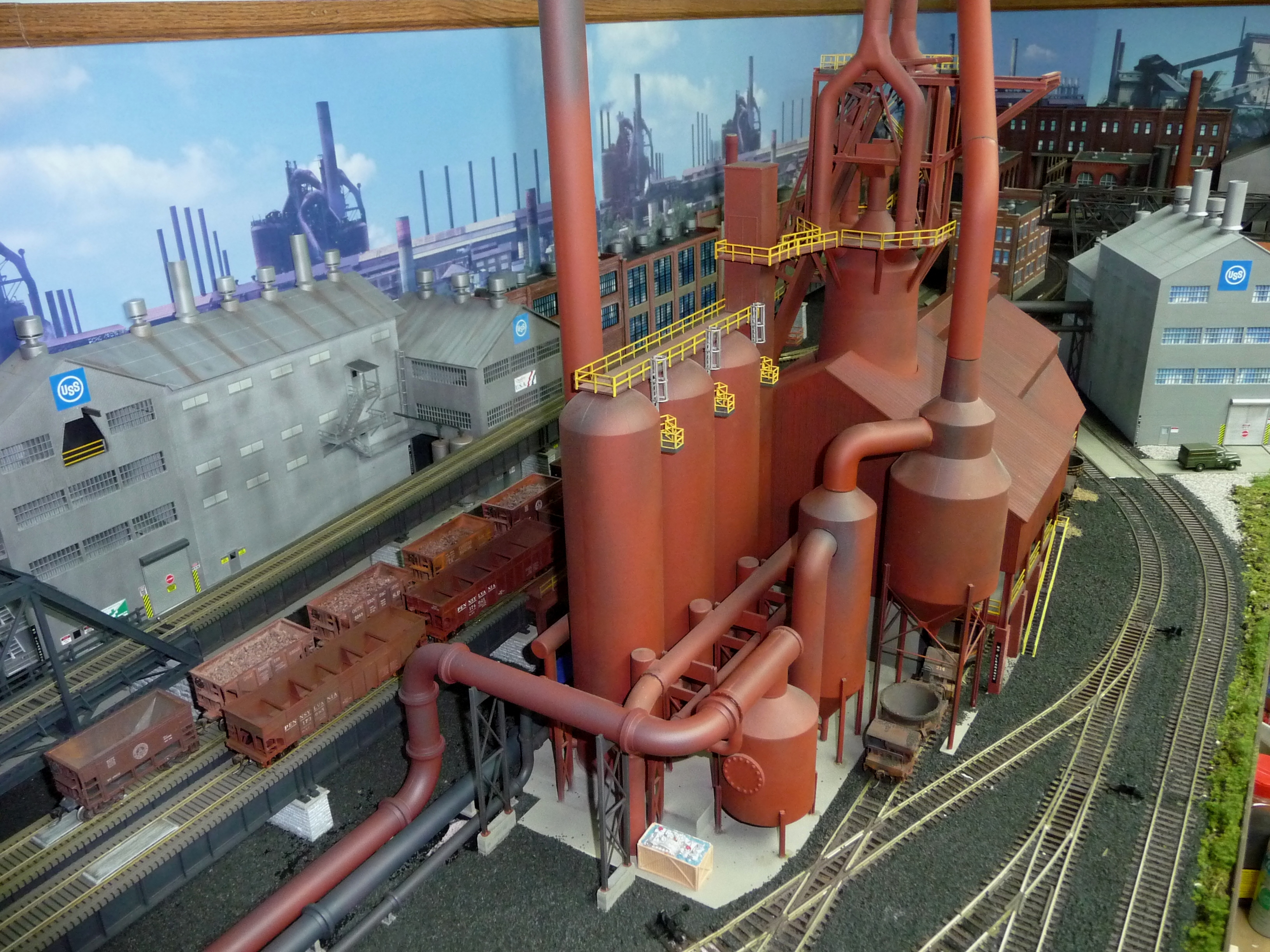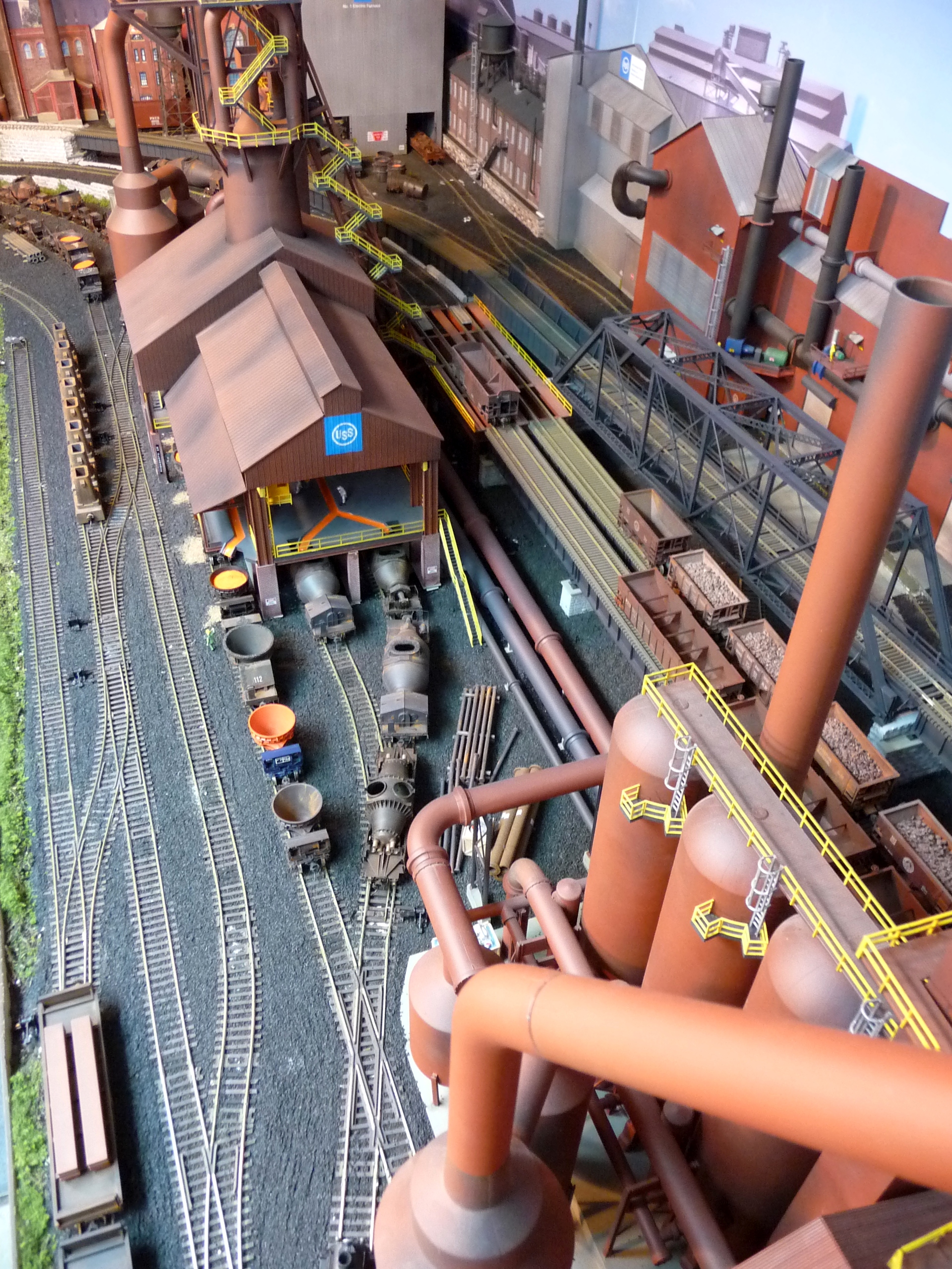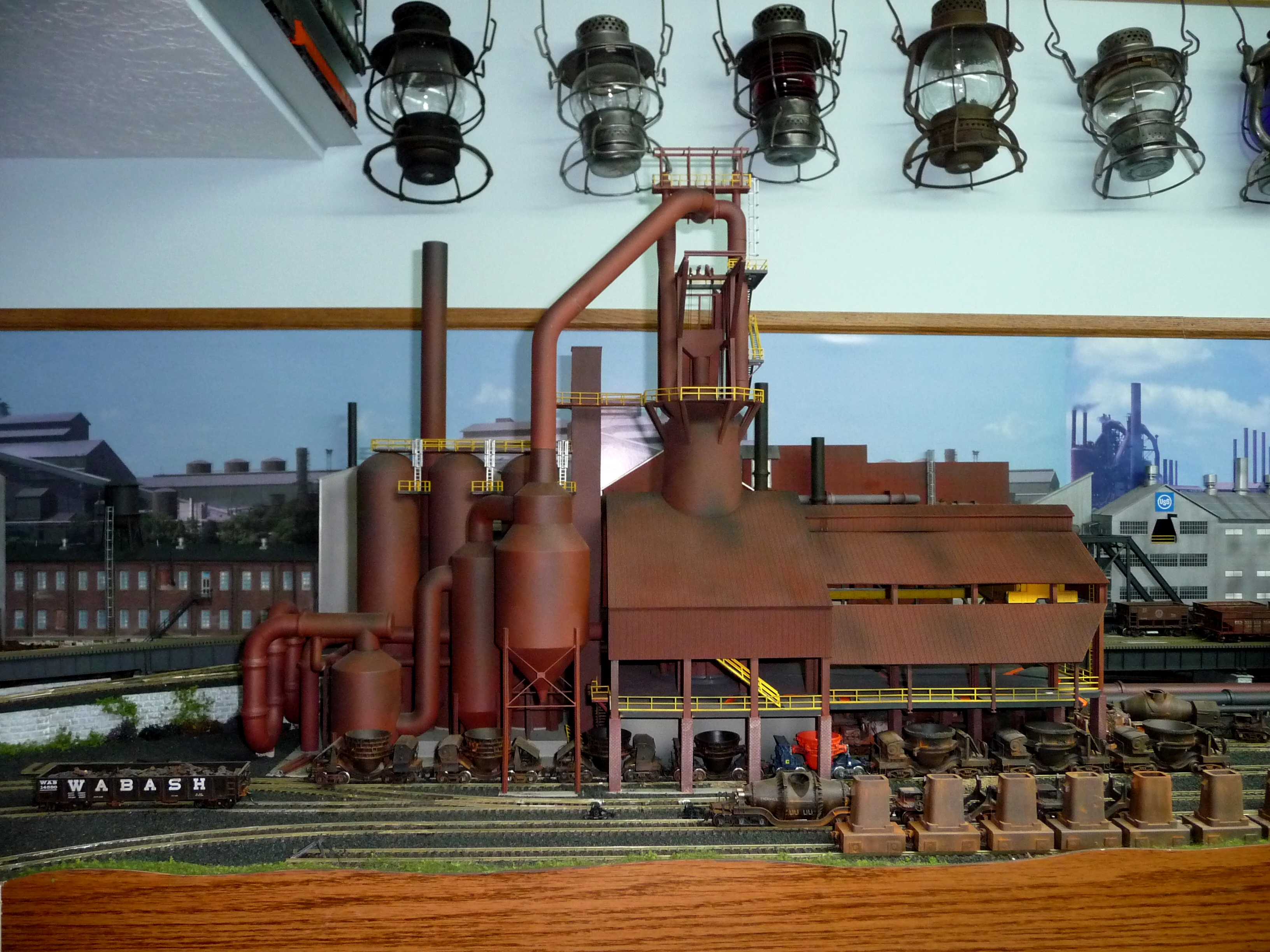 5. Aerial View of #1 Blast Furnace with high line and B&O elevated track. Background buildings are scratch built. The first blast furnace was introduced in 1895 at Duquesne, Pennsylvania. It was so dramatic that it was originally called the Duquesne Revolution. |