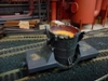 38. Hot metal ladle car is equipped with wings for pig machine service, so a crane can lift and tip the vessel clear of the car at the base of the pig machine. |